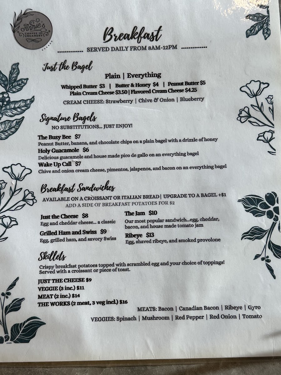 Annie’s Coffee and Creamery offers a delightful and diverse menu perfect for breakfast, lunch, and sweet treats. For breakfast, served daily from 8 AM to 12 PM, guests can enjoy a variety of bagels with options like Plain or Everything, served with Whipped Butter, Butter & Honey, or Peanut Butter. A unique selection of Signature Bagels is also available, including the popular The Busy Bee, Holy Guacamole, and Wake Up Call. For a heartier breakfast, the Breakfast Sandwiches are served on either a croissant or Italian bread, with choices like Just the Cheese, Grilled Ham and Swiss, The Jam, or Ribeye.